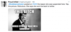 Over the weekend, Pauly’s account was suspended again. Pauly has moved her social media presence to Gab.ai, a site that welcomes and nurtures all sorts of hard-right bile, and has claimed that she was banned for posting a misogynist (and, Frankly [as in Sinatra], lame) meme with an old photo of Dean Martin.