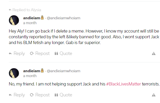 Andie is claiming her most recent suspension was for posting a Dean Martin meme and that Twitter wants her to delete it before they’ll unsuspend her.