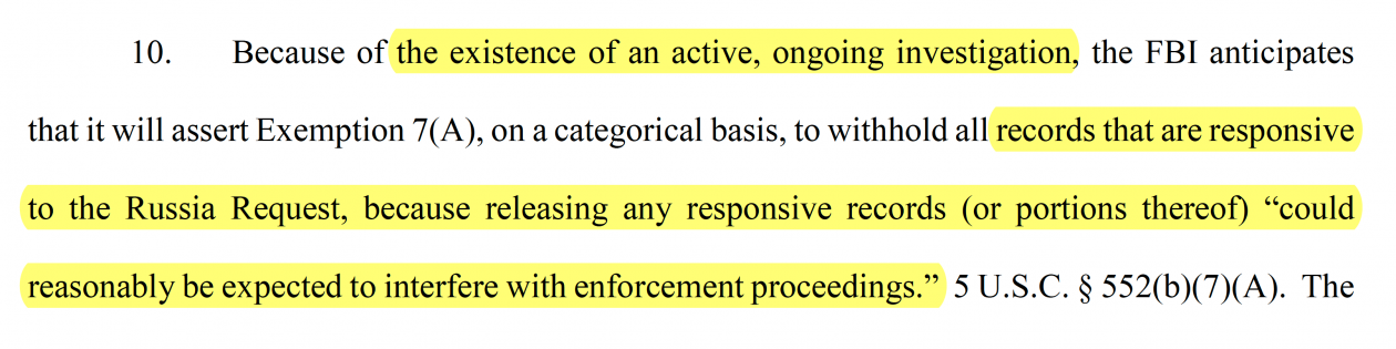 In a court filing in this case on April 6, 2017, a Justice Department attorney representing the FBI informed the Court that there is an “active, ongoing investigation” pertaining to this matter and claimed that disclosing the “records that are responsive to the Russia Request” could reasonably be expected to interfere with “enforcement proceedings.”