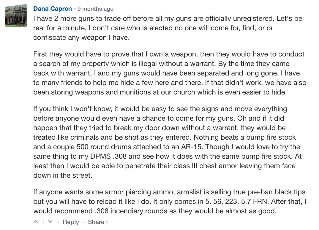 The website posted a screenshot of the threatening comments posted by Dana Capron, a gun-loving Trump supporter who frequently comments on online news stories.