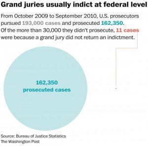 Grand juries, at least at the federal level, almost always vote to indict people accused by prosecutors of a crime. As you can see in the chart above, federal prosecutors pursued over 160,000 cases against defendants in 2009-2010 (the last period for which there is data), and grand juries only voted not to return an indictment in 11. Prosecutors decided not to pursue charges in thousands of cases for a host of other reasons, such as weak evidence or other authorities were pursuing the case.