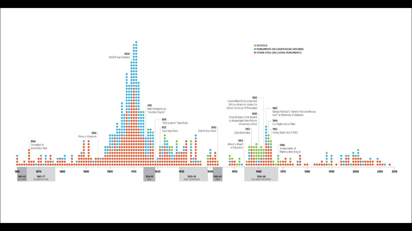 A striking graphic from the Southern Poverty Law Center revealed that the majority of Confederate monuments weren’t erected until after 1900 — decades after the Civil War ended in 1865. Notably, the construction of Confederate monuments peaked in the 1910s and 1920s, when states were enacting Jim Crow laws, and later in the 1950s and 1960s, amid the Civil Rights Movement.