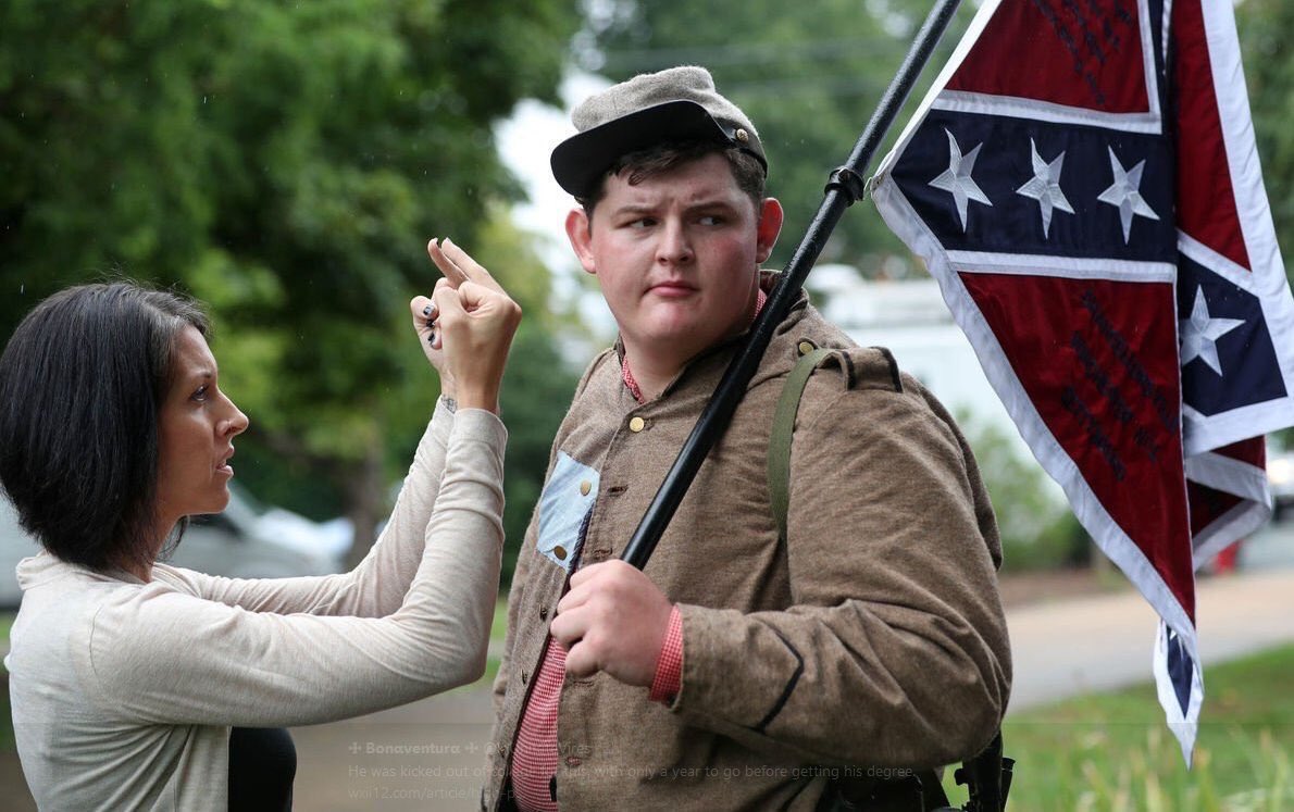 First came this photograph (click to enlarge and indulge in its full-sized glory), which had gone slightly viral on Twitter and Facebook, in which we see a young woman sharing her sentiments with a rotund Confederate soldier wannabe. Poor fella looks a little – well, uncomfortable around a strong and assertive woman. [UPDATE: The photo was taken Tuesday in Charlottesville, Virginia, at the site of a statue to one Robert E. Lee – more below.]