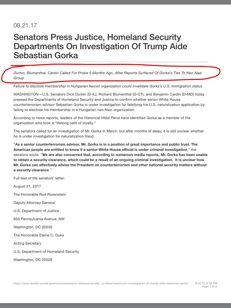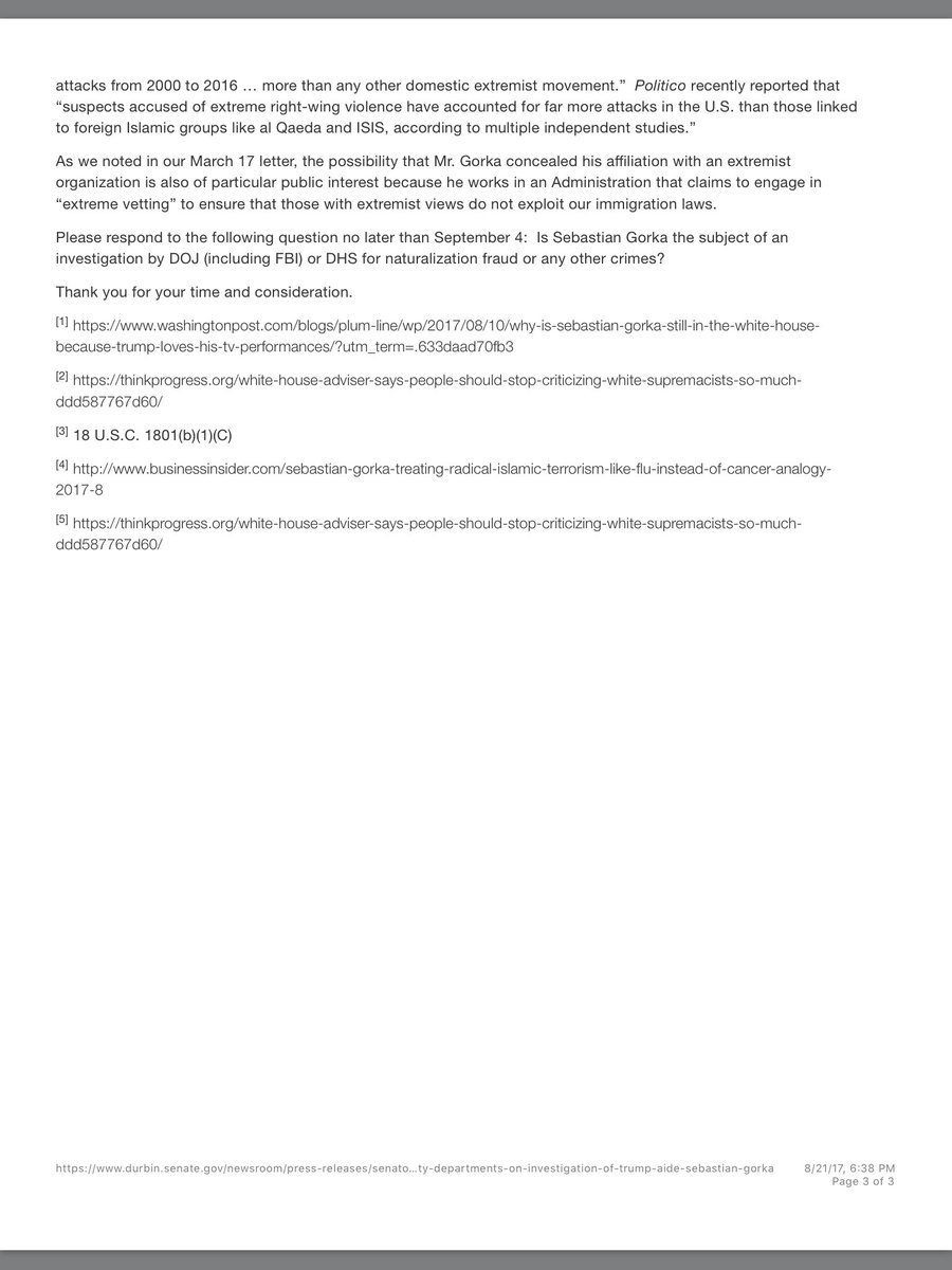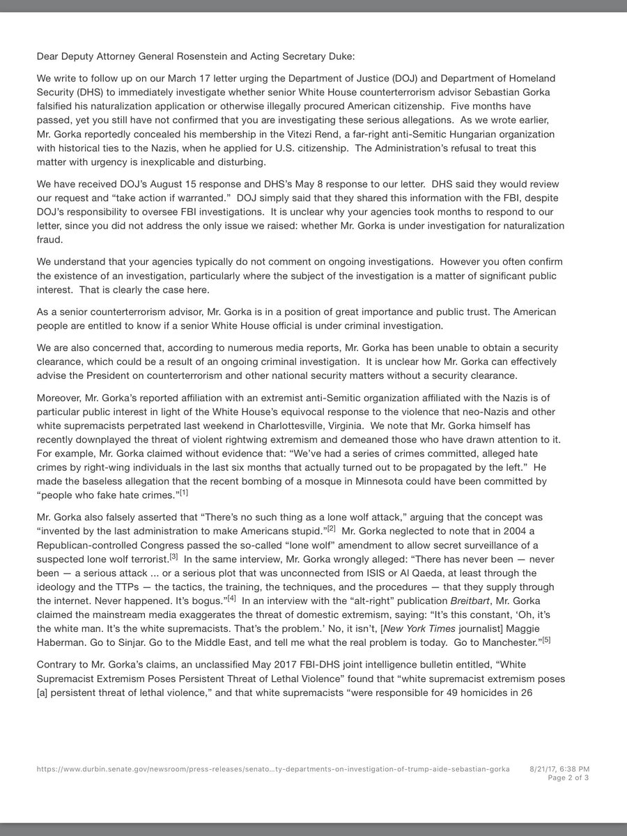 Here is the letter Senator Blumenthal, along with Senators Dick Durbin and Benjamin Cardin, sent to Deputy AG Rod Rosenstein concerning apparent investigative foot-dragging into the truth about Gorka (click on each page to enlarge):