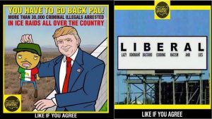 On Facebook, a Russian created community called “SecureBorders” with 133,000 followers, began publishing racists ads to amplify Trump’s message, including one of a cartoon Trump dangling a man wearing a T-shirt with a Mexican flag over a wall with the headline “You have to go back pal.”