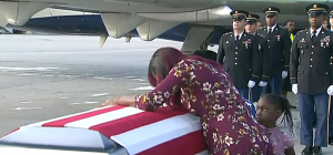 This is a photo of Myeshia Johnson crying over the coffin of her husband, Sgt. La David Johnson, a Green Beret who had been working with an elite U.S. Army Special Forces unit when he was killed in action in northwestern Africa. She has two children and is pregnant with their third. Several reports state that his funeral will have to be a “closed casket” ceremony.