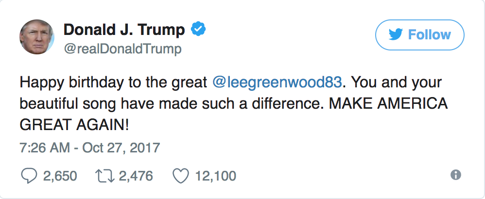 Poor @leegreenwood83, “lawyer focused on Washington DC sports,” mistaken by the president for @TheLeeGreenwood, renowned songwriter. https://t.co/AZX6VXLT36