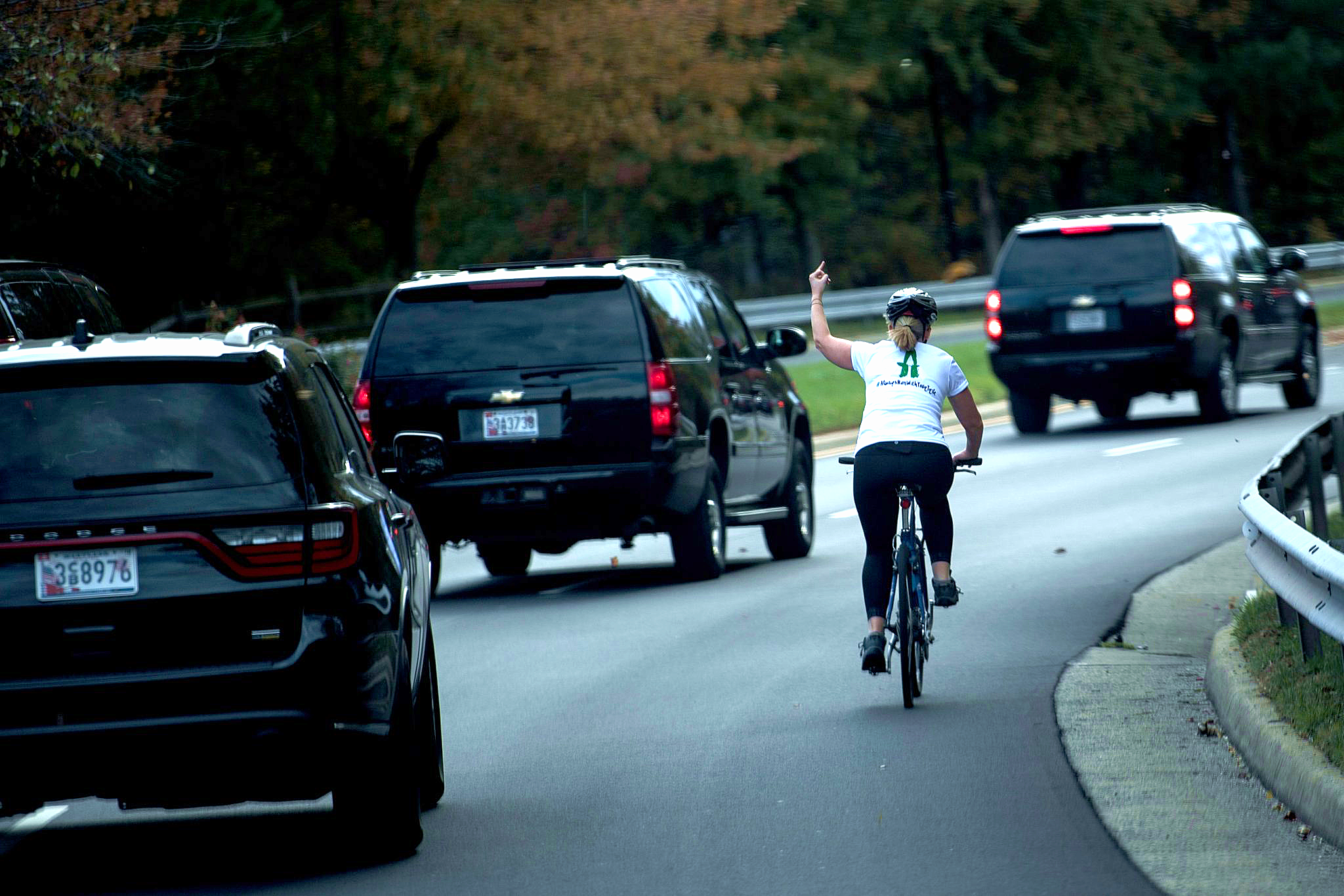 Woman flips off Trump after pursuing his motorcade on bicycle