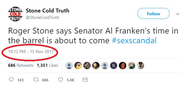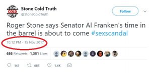 The move comes days after @StoneColdTruth teased a scandal story about Senator Al Franken; the next day, Los Angeles radio personality LeeAnn Tweeden went public with her claim that Franken had given her a crude and unwelcome kiss, along with a raunchy photograph of Franken apparently pretending to “grope” Tweeden.