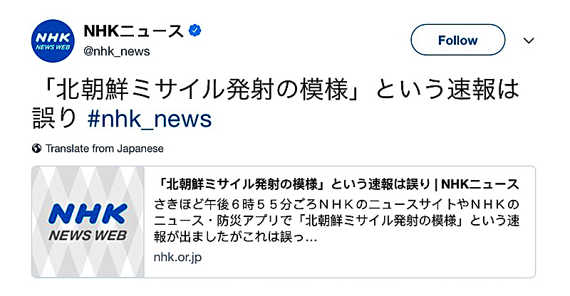 Multiple sources report that it took only a few minutes for NHK to alert viewers and phone users to the error — unlike the false alert in Hawaii, which was not corrected for 38 minutes.