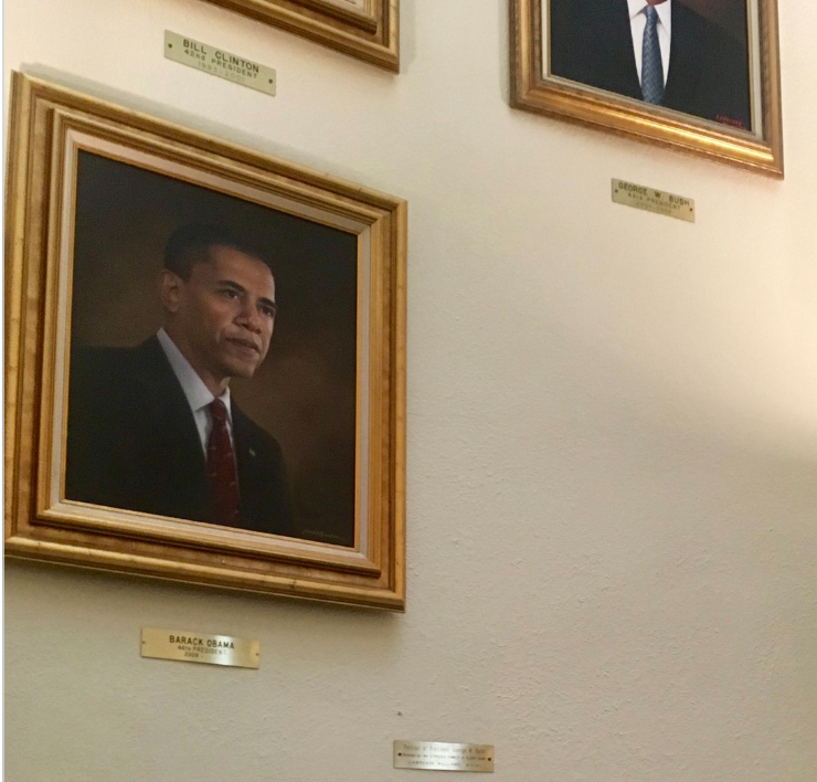 But on Thursday, a prankster placed a portrait of Russian President Vladimir Putin on an easel below the blank space on the wall where Trump’s portrait would go.