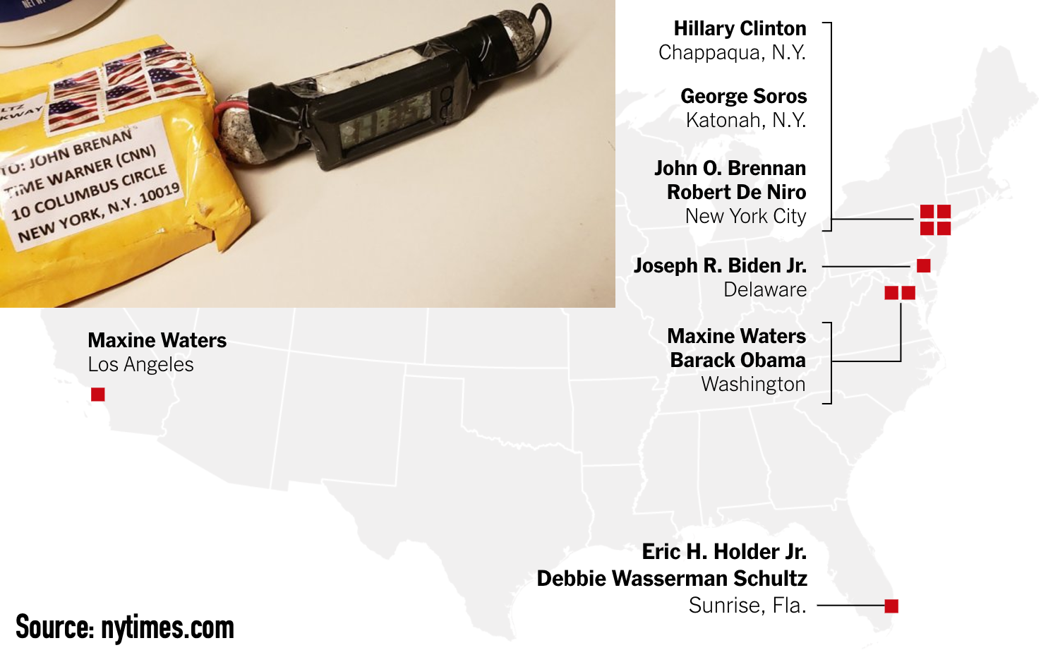 A law enforcement official said the envelope and printed address labels on the package sent to Mr. De Niro were similar to those on explosives sent to former President Barack Obama, former Secretary of State Hillary Clinton and others, and an X-ray showed it contained a similar device resembling a pipe bomb.